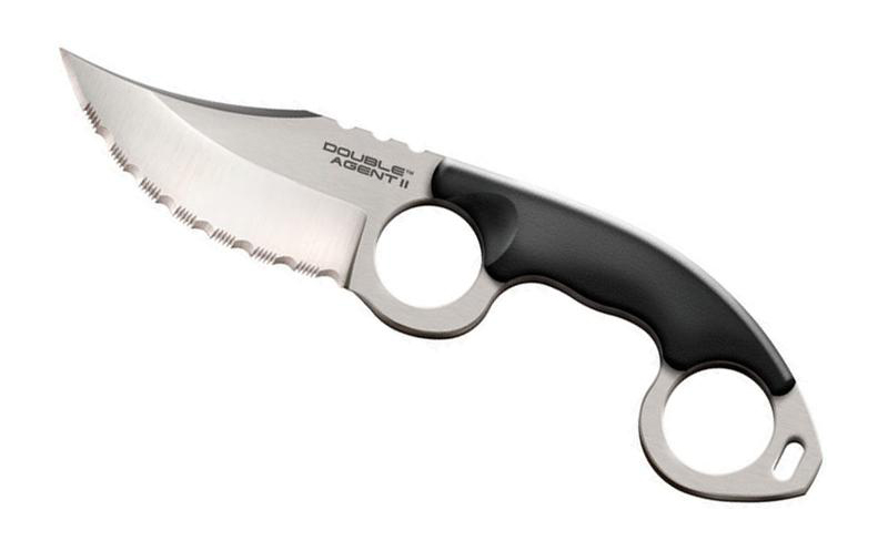 Компания Cold Steel в своем богатом арсенале имеет замечательный нож узконаправленного предназначения - Double Agent. Воплотить в жизнь его смог дизайнер и ножедел Зак Уитсон (Zach Whitson). Ему удалось удачно интерпретировать легкий небольшой нож с полнохвостовой конструкцией и двумя отверстиями для пальцев. Такой тип ножей относится к категории шейных и, не смотря на специфические формы, пользуется очень большой популярностью. Cold Steel Double Agent II обладает серрейторным лезвием в форме Clip Point из нержавеющей стали AUS-8A, способной отлично выдерживать нагрузки и сохранять режущую кромку острой. Рукоять ножа изготовлена из прочного Griv-Ex™, способствующего отличному удержанию ножа в руке. Противоскользящая текстура рукояти, вместе с отверстиями для пальцев, позволяют уверенно работать ножем как прямым, так и обратным хватом. Cold Steel Double Agent комплектуется надежными и комфортными Secure-Ex ножнами, а также цепочкой для ношения на шее. Упакован в блистер.