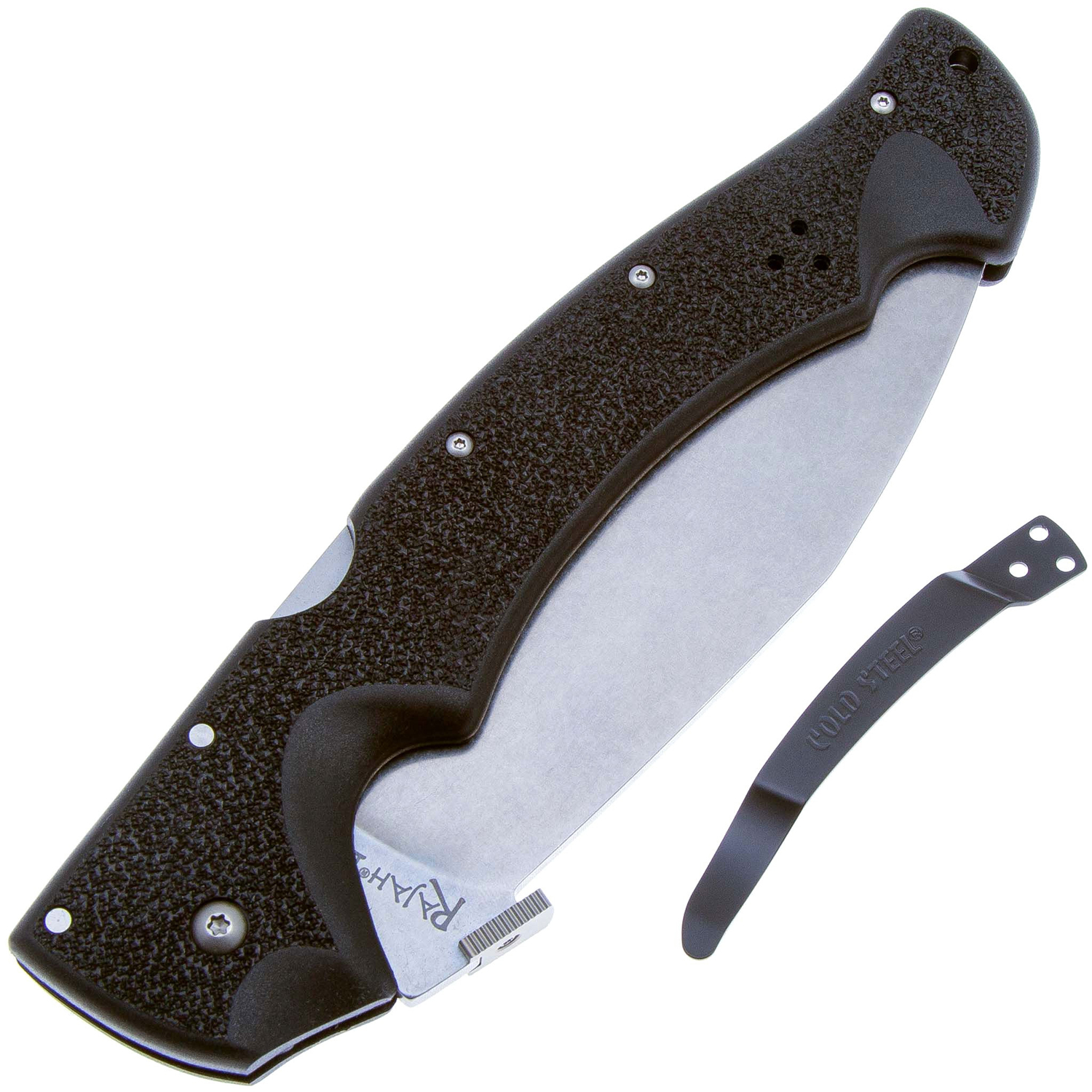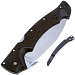 Складной кукри от Cold Steel. Несмотря на немалые размеры, нож можно носить даже в джинсах, о чем свидетельствует двухпозиционная клипса. Спуски на клинке идут от обуха, поэтому нож в целом неплохо режет, однако создавался он для того чтобы рубить или выполнять другую грубую работу. Удобен для открытия и левой и правой рукой, из-за установленного вейва. Он же помогает ножу раскрыться при вытаскивании из кармана.