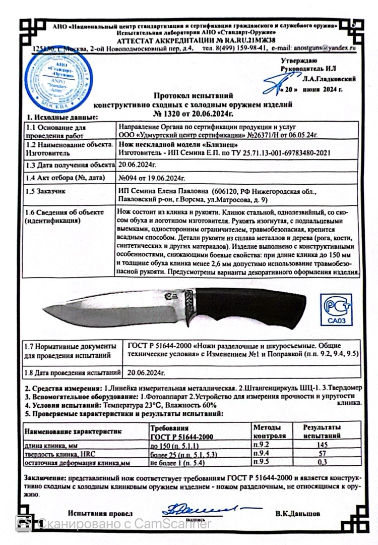 Нож "Близнец", сделанный вручную мастерами кузницы Сёмина из города Ворсма. При ковке клинка использовалась сталь AUS 8, твердость которой составляет 54 - 56 HRC. Для изготовления рукояти используется Elastron. Данная модель отлично подойдет охотникам и любителям активного отдыха. Оформление рукояти в комплекте с изысканными ножнами способны превратить нож «Близнец» в отличный подарок.