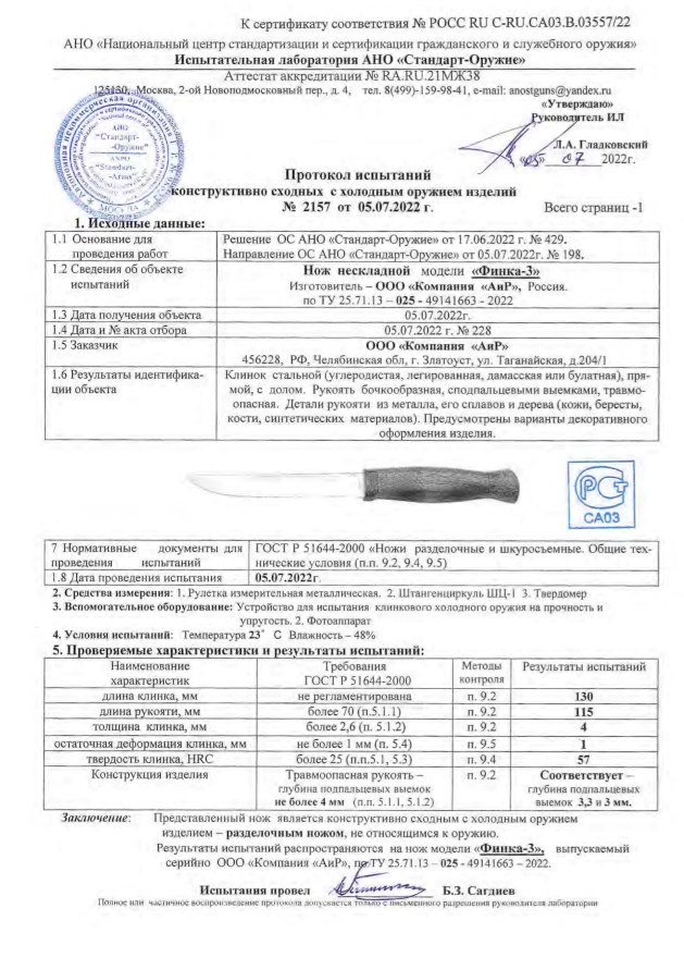 Рукоять выполнена из древесины граба. Дерево является одним из самых традиционных и распространенных материалов для рукоятей ножей. Основным плюсом древесины является то, что, благодаря своей текстуре, она без особых усилий принимает практически любую художественную форму рукояти. Рукояти из граба относительно тяжелые, но при этом благодаря высокой плотности древесины они прочные, твердые, износостойкие. Обладают повышенным сопротивлением к воздействию микроорганизмов, плесени и гнили.