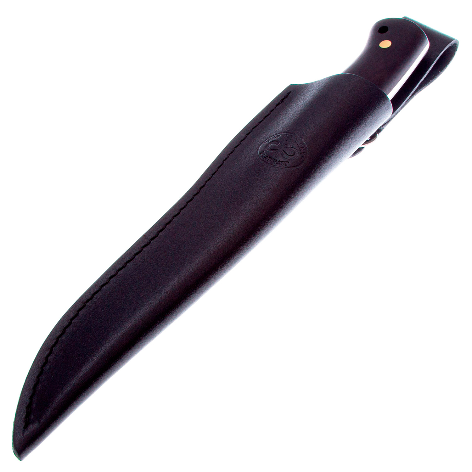 Леший — отличный нож для туризма и рыбалки. Нож имеет конструкцию фултанг, что придает ножу еще большую надежность. Этот нож будет удобен для разделки мяса. Нож «Леший» – солидный нож с серьезным мощным клинком. Клинок ножа выполнен с понижением линии обуха, благодаря чему острие находится на оси приложения силы и легко входит в древесину, продукты, тушу животного. Спуски от середины ширины клинка образуют прекрасно режущее лезвие. Для удобства в работе в основании клинка сделан подпальцевый радиус. На ближней к рукояти части обуха имеется небольшой серрейтор. Долы на каждой стороне клинка значительно уменьшают его вес, при этом сохраняя прочность. Монтаж рукояти накладной, неразборный. Нож «Леший» – идеальный рабочий нож для охоты, похода, выживания, использования в быту и фермерском хозяйстве. Сталь клинка 95Х18. Это отечественная сталь среднего сегмента. Из-за высокого содержания хрома она не боится коррозии, а содержание углерода 0.95 позволяет неплохо держать заточку. На клинке сделан так называемый «чойл» — выемка под указательный палец у начала кромки. Из-за нее ножом будет удобно производить, не только мощные, но и вполне аккуратные работы. Кроме того, наличие «чойла» будет удобно при заточке. Материал рукояти — древесина граба. Дерево является одним из самых традиционных и распространенных материалов для рукоятей ножей. Основным плюсом древесины является то, что, благодаря своей текстуре, она позволяет без особых усилий практически любую художественную форму рукояти. Традиционно используется на охотничьих ножах. Рукоятка имеет эргономичную форму, что позволяет пользоваться ножом человеку с любым размером ладони.
