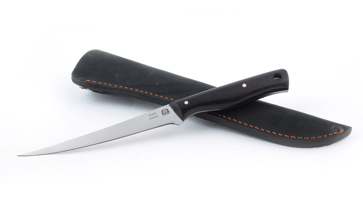 Нож "Филейный малый" - это многофункциональный охотничий нож, который пригодится своему владельцу на все случаи жизни: на природе, охоте, рыбалке и в туристическом походе. Рукоять ножа выполнена из Венге (черное тропическое дерево). Лезвие изготовлено из нержавеющей стали высокого качества 95Х18. К слову, данный вид стали используется для изготовления самых прочных, надежных и долговечных ножей. В комплекте ножны из натуральной кожи.