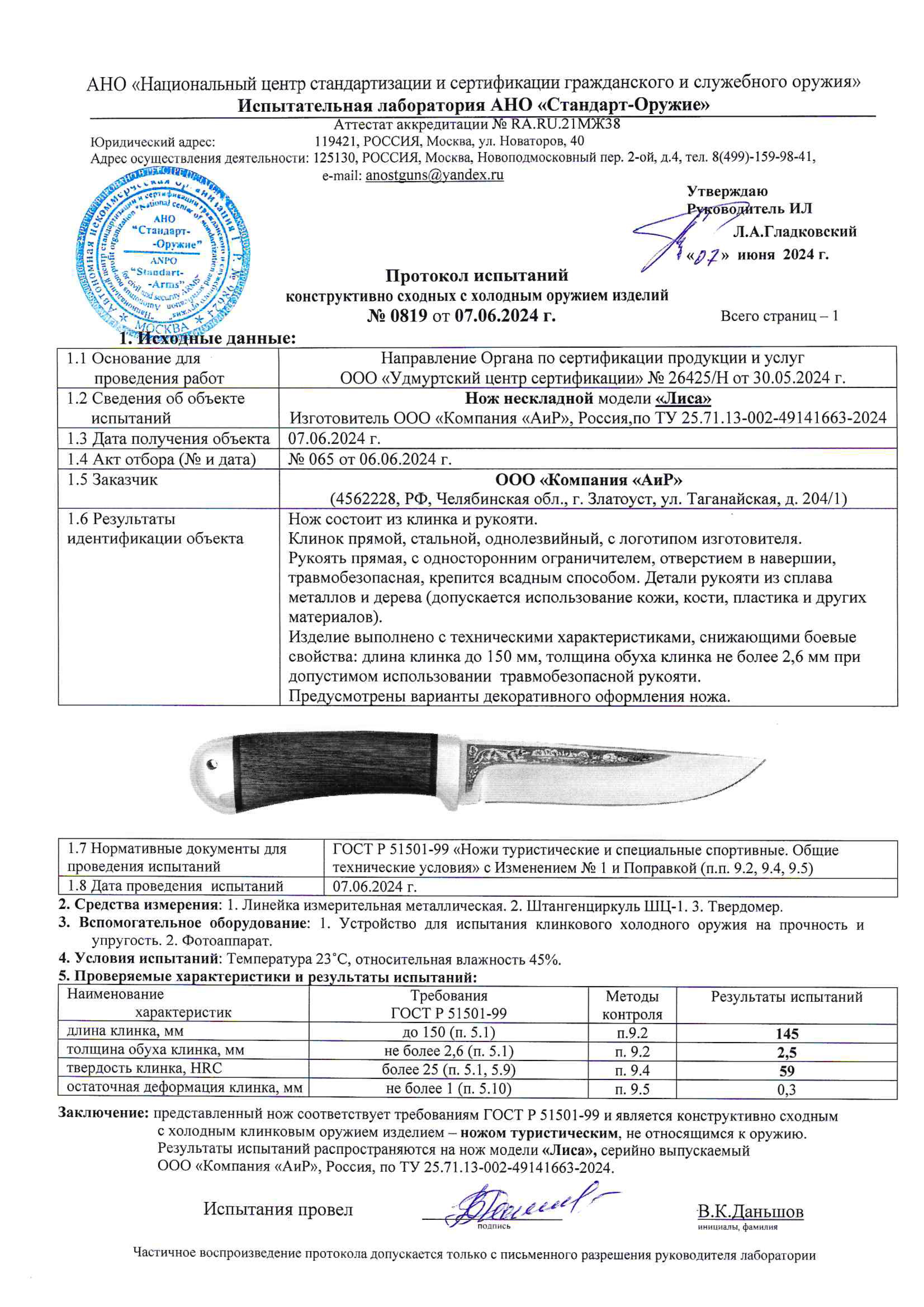 Сравнительно небольшой, универсальный, легкий и прочный нож с клинком, имеющим чуть приспущенный к острию обушок. Спуски в виде линзы на большую часть ширины клинка образуют тонкое, изумительно режущее лезвие. Толщина обуха в 2,4 мм позволяет оставить приличную голомень, что придает ему дополнительную прочность. Рукоятка имеет эргономичную форму, что позволяет пользоваться ножом человеку с любым размером ладони. Гарда умеренной величины защищает пальцы при резе. Монтаж клинка сквозной, неразборный. На навершии рукояти имеется отверстие под темляк. Великолепное решение для тех, кто любит проводить время на природе и вдали от городской суеты.