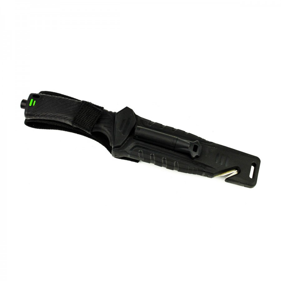 Рукоятка изготовлена из пластика ABS. Он относится к группе термопластиков, которые известны прочностью и долговечностью. Рукоятка в данной модели может комбинировать элементы черного и оранжевого цвета, либо черного и зеленого. В этих же оттенках выполнен и чехол для ножа. Он сделан из нейлона и пластика, а нож удерживает внутри при помощи застежки-липучки. С обратной стороны чехла встроена компактная металлическая пластина с алмазным напылением, которая является практичной и легкой точилкой для ровного участка лезвия. Кроме того, в чехол встроен стропорез, а в специальном гнезде закреплено вынимающееся огниво. В дополнение к этому, рукоятка ножа оканчивается небольшим плоским выступом, выполняющим роль стеклобоя.