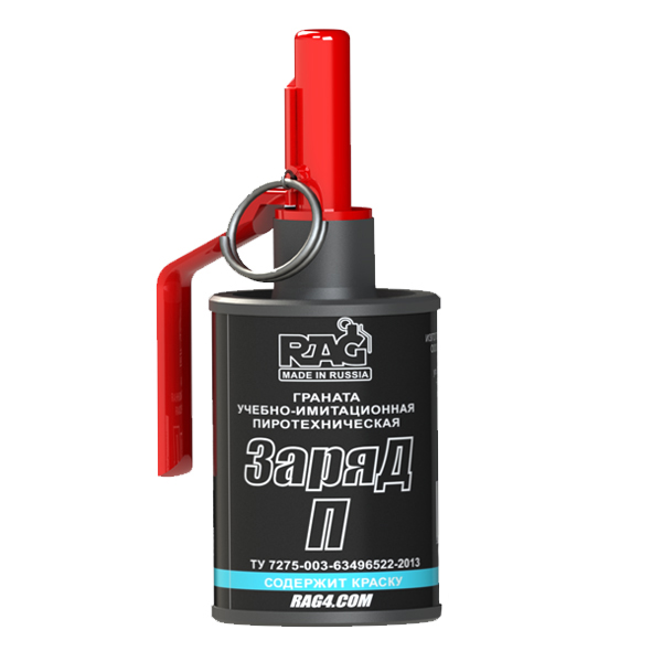 Учебно-имитационная пиротехническая граната RAG "Заряд" П. Является самым компактным изделием с наполнителем в виде краски и активной чекой на рынке РФ. Предназначена для применения в военно-спортивных играх, таких как пейнтбол или страйкбол. Срабатывает с громким хлопком и маленькой вспышкой, при этом разбрызгивая жидкостный краситель. Радиус эффективного маркирования составляет не менее 10-15 м, а радиус разлёта элементов - не более 5-10 м.