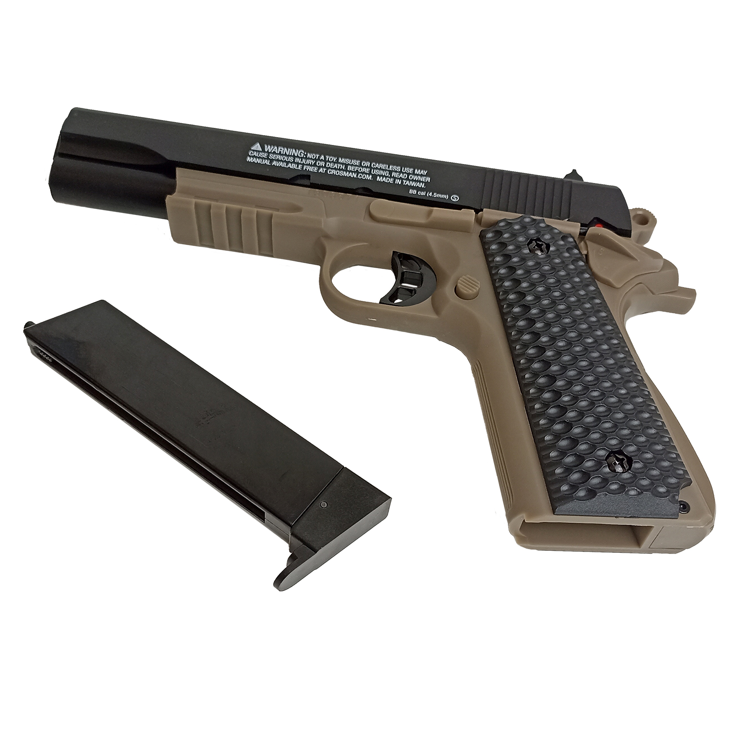 Пистолет пневматический Crosman S1911 с калибром 4,5 миллиметров – это пружинно-поршневая модель, которая создана в стиле классического пистолета Colt 1911, имеет гладкий ствол без имитации отдачи. Для стрельбы из пистолета используются стальные шарики.