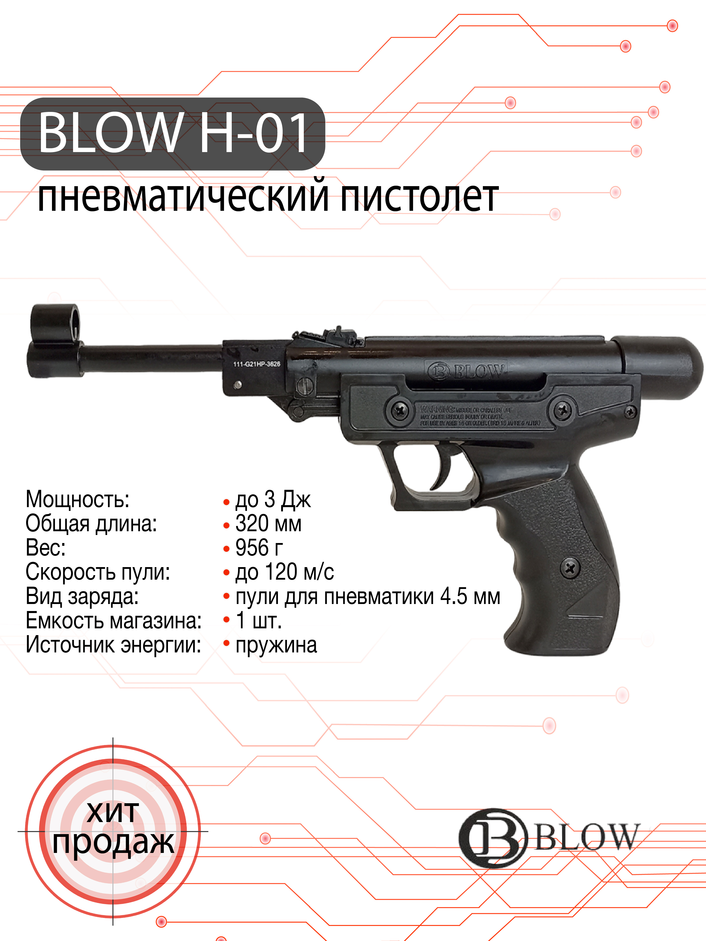 e-mail и системе обратной связи (в любое удобное для вас время). Информация от товаре Пистолет пневматический Blow H-01 (чёрный) носит ознакомительный характер, характеристики, внешний вид, цвет и комплектация могут быть изменены производителем без уведомления.