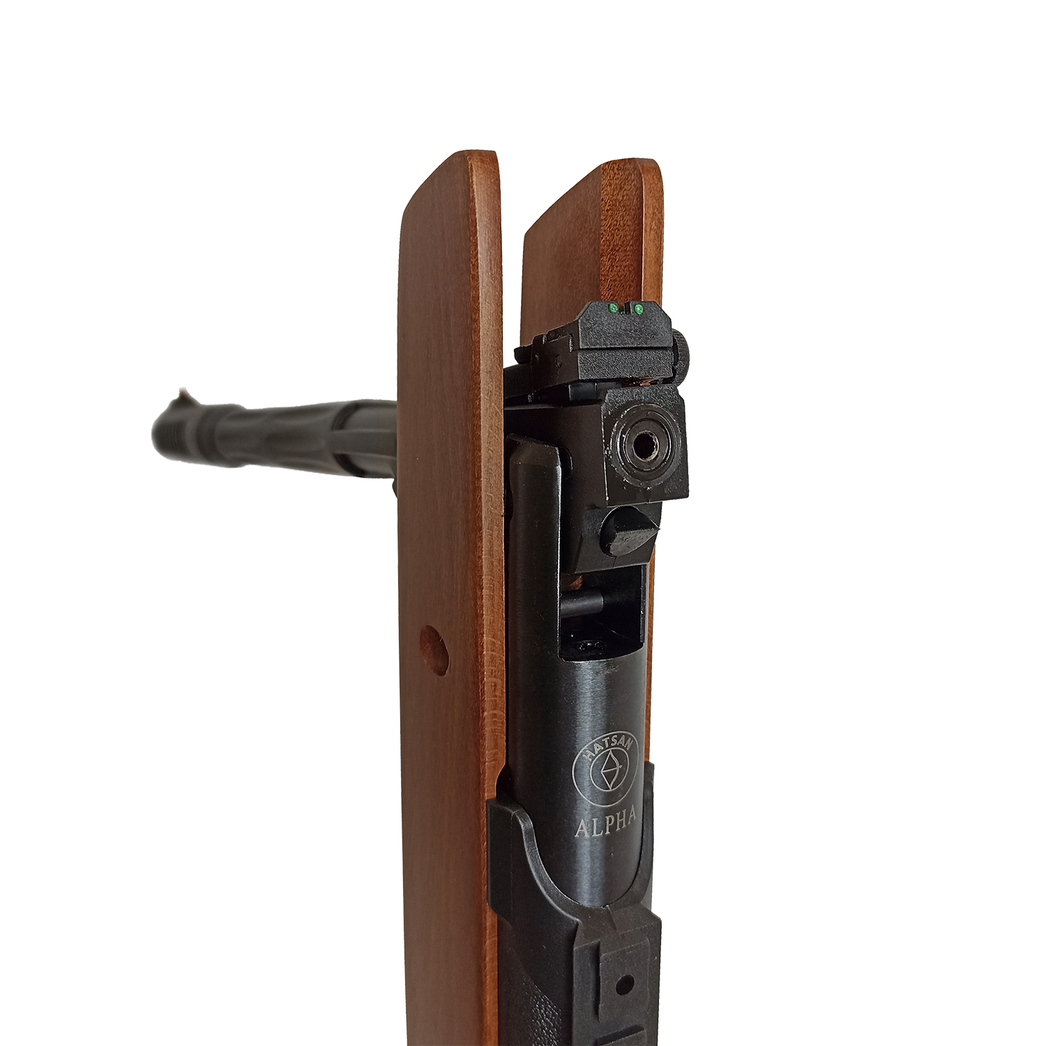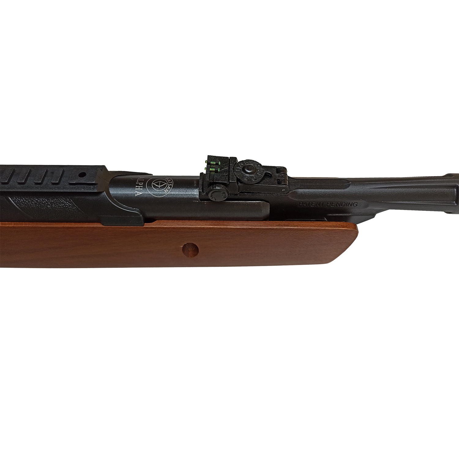 Пневматическая винтовка Hatsan Alpha имеет корпус из дерева. На прикладе имеется подщечник эргономичной формы, удобный и левшам, и правшам. Мягкий затыльник приклада обеспечивает гашения порядка 50% отдачи. Пружинно-поршневая пневматическая система позволяет достичь скорости выстрела до 250 м/с.
