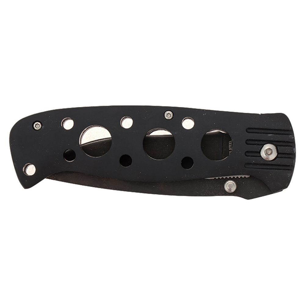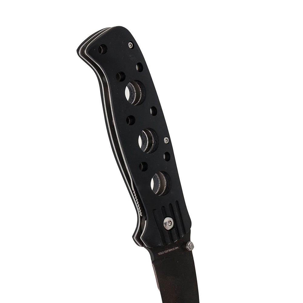 Рукоять алюминиевая, а перфорация значительно уменьшает общий вес ножа. Легкие алюминиевые ручки также черного цвета и позволяют сэкономить на весе благодаря отверстиям. Покрытие дает ножу изящность.