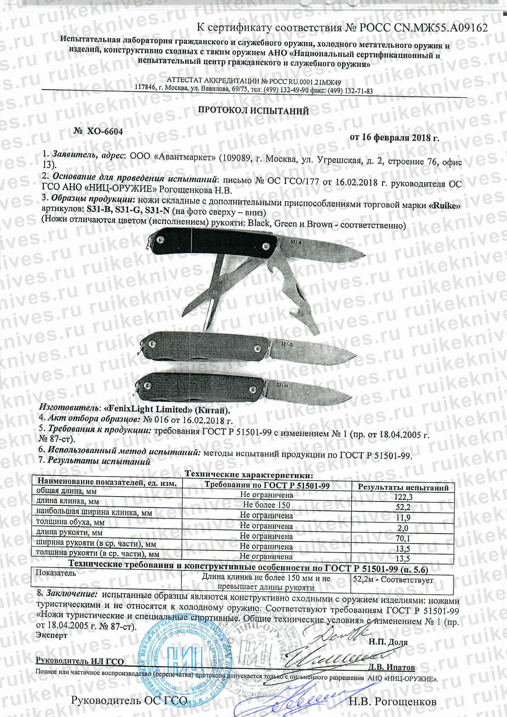 Все выше обозначенные инструменты выполнены из нержавеющей стали марки Sandvik 12C27. Применение данного материала крайне позитивно сказывается на долговечности и прочности ножа Ruike S31. К тому же, данный металл не подвержен коррозии, что позволяет применять данную модель в любую погоду, не опасаясь что из-за влаги она заржавеет.