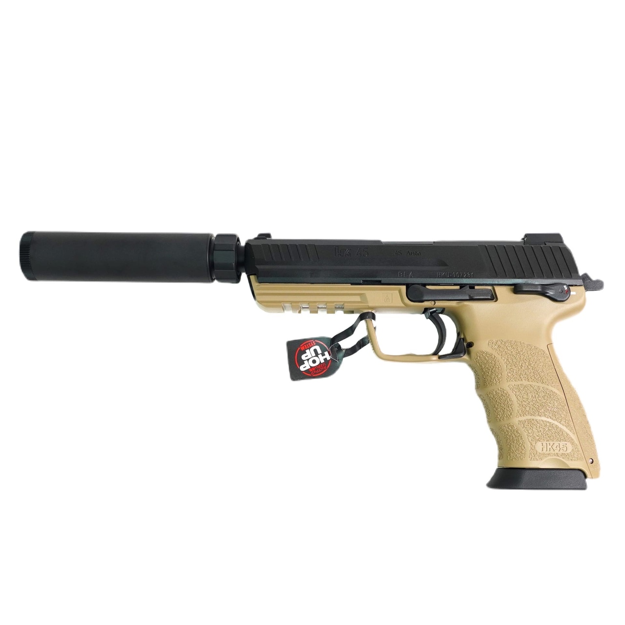 Пистолет страйкбольный (Tokyo marui) HK45 Tactical GBB, черный/тан, модератор 142764