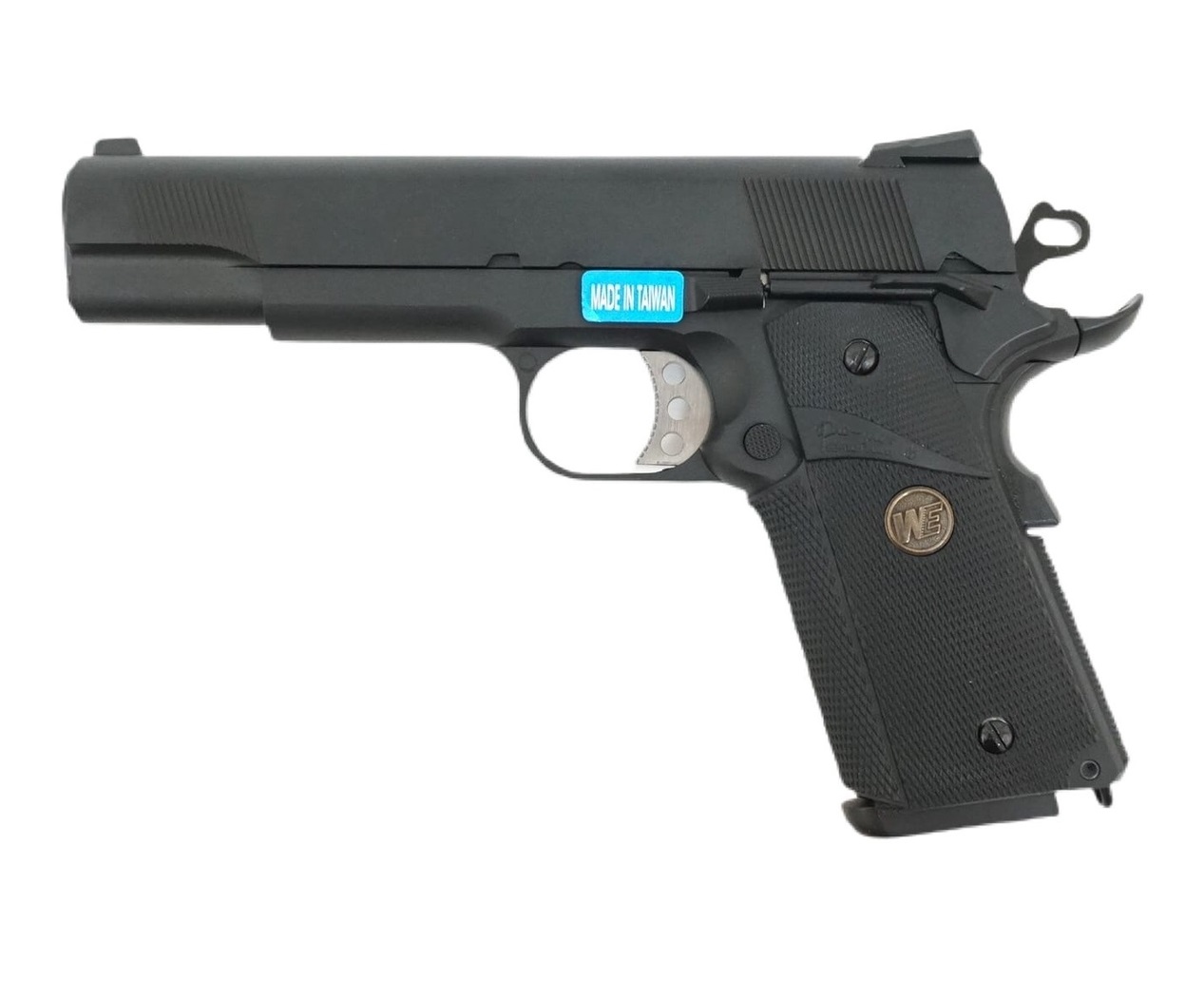 Страйкбольный пистолет WE Colt (M1911) M.E.U. Black – это популярная air-soft модификация от тайваньского производителя, реплика Кольта М1911 в его классическом варианте. Модель отличается высокой степенью копийности, все детали схожи по функционалу с боевым прототипом, как и неполная разборка. Полная зарядка резервуара дает возможность выполнить 25-30 выстрелов. Процесс заправки прост и доступен каждому – от газового баллона. Hop-up здесь регулируемого типа, шарики при выстреле показывают хорошую аэродинамику, а также кучность и точность попадания в цель. Скорость выстрела – 85 м/с, режим огня – «полуавтомат». Пистолет продается свободно за счет малой дульной мощности. Модель отличается крючком спуска прямого действия, аналогично боевому пистолету. Корпус изготовлен из алюминиевого сплава, как и внутренние механизмы. Накладки на рукоять с фактурной поверхностью изготовлены из пластика. Предохранитель имеет двухсторонний флажок. Ниже ствола пистолета WE Colt (M1911) установлена направляющая для установки допоборудования вроде фонаря или лазерного целеуказателя. Длина пистолета 222 мм, вес 1025 г. Продается в комплекте с инструкцией и магазином.